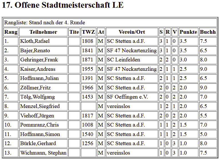 Die vierte Runde der Stadtmeisterschaft wartete wieder mit ein paar überraschenden Ergebnissen auf, vor allem an der Tabellenspitze konnten Renato, Frank und ich für Klarheit sorgen, wer am Ende um den Turniersieg mitspielen wird: