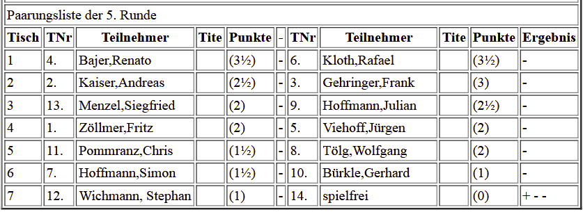 Es gibt keine Doppelpreise und die Preisgelder können noch reduziert werden, da es weniger als 15 Teilnehmer gibt. Wir wünschen allen Teilnehmern viel Spaß und Erfolg in der letzten Runde! Hier die Paarungen: