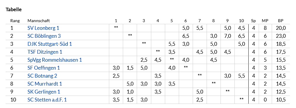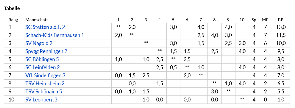 Im Spitzenspiel Schach-Kids Bernhausen 1 gegen Schachclub Stetten 2 konnte unsere Mannschaft mit einem 2 zu 2 die Tabellenspitze in der B-Klasse behaupten. Deutlich schwerer tat sich zeitgleich Stetten 1 gegen Botnang 2 in der Bezirksliga und verlor, etwas unter Wert geschlagen, mit 2,5 zu 5,5.