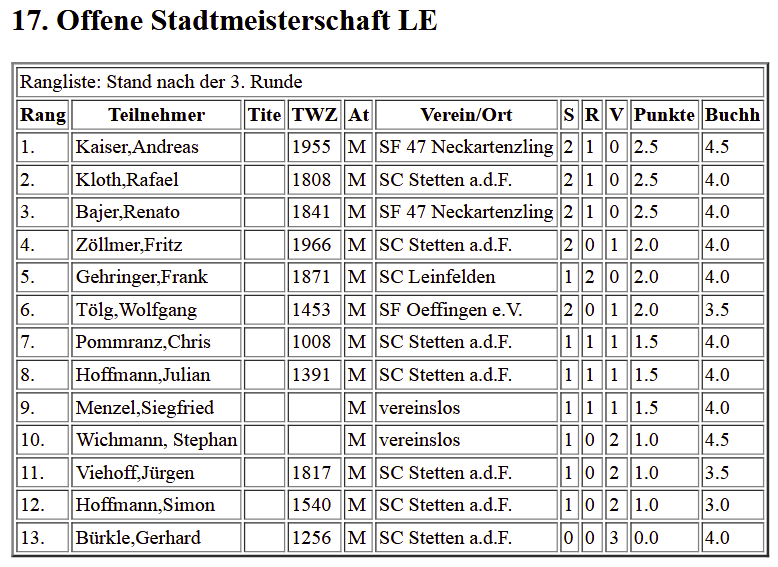 Die dritte Runde der Stadtmeisterschaft startete mit einem kleinen Weihnachtsgruß, was die aktuellen Tabellenführer anscheinend zu übermäßiger Harmonie am Schbrett verleitete. Zumindest aber in der unteren Tabellenhälfte sollte es hoch her gehen, auch wenn diesmal die großen Überraschungen ausblieben.