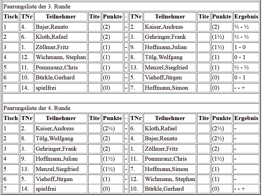 Stark zurück meldete sich auch Wolfgang nach seiner Spielpause, mit seinem Sieg gegen Stephan ist er jetzt direkt der Spitzengruppe auf den Fersen. Die erste Verfolgerrolle teilt er sich jedoch mit Fritz, der in seiner Partie gegen Julian genug kleine Vorteile einsammeln konnte, so dass er sich ein typisches Fritz-Endspiel mit Bauernmasse erarbeitete, das er sicher verwertete.